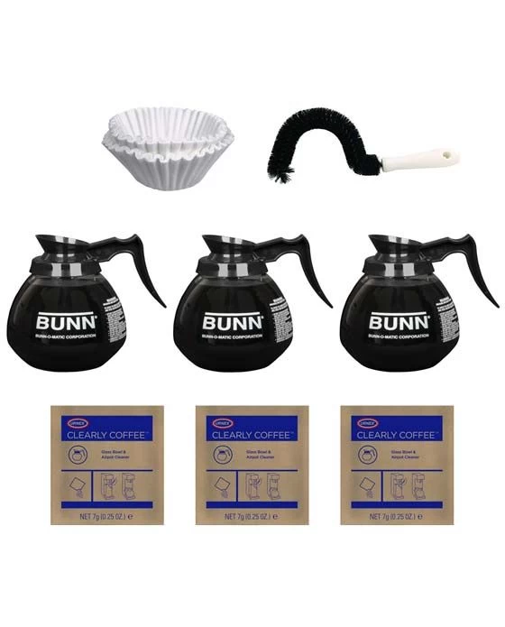 This sale is for the following products: – 3 bunn coffee pots (black/regular) 64 oz. (1.9 liter) capacity. Reliable, shatter-resistant, and perfectly balanced laboratory-grade, stress-free glass State-of-the-art connection process used with food grade polymeric materials is more earth-friendly and eliminates the need for vinyl gaskets or “O” rings precise design mold stands up to rigors of temperature adjustments, day-after-day unique high-temperature printing process for logo applications so images will retain their design integrity through heavy use and washing ergonomic handle design means easy manipulation of full, hot decanter – 3 pack of urnex (1 pack cleans 3 pots) – 1 cleaning brush – 100 cf12 filters