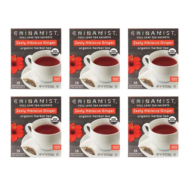 China Mist Organic Zesty Hibiscus Ginger Tea Sachets 6 Boxes 15 Count each