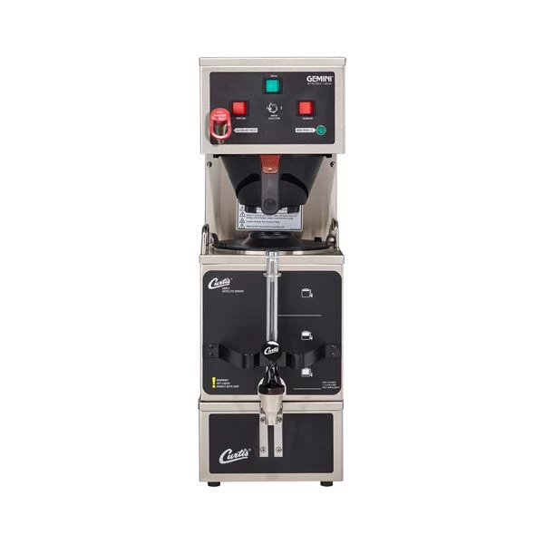 Gemini® Coffee Brewer, single, 1 gallon capacity, automatic, analog, 12 or 24 cup brew/batch, 4-1/2 gallons per hour, 2.2 gallon tank volume, fresh brew, double wall insulated server with locking lid, hot water faucet, plastic brew basketstainless steel, 120v/50/60/1-ph, 1775 watts, 15 amps, 1 GPM, 2W+G, 20-90 psi, 1/4″ flare fitting, cULus, NSF.