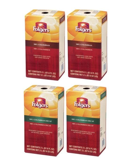 - This sale is for one case (2 boxes) of Folgers 100% Colombian Liquid Coffee & one case (2 boxes) of Folgers 100% Colombian Decaffeinated Liquid Coffee